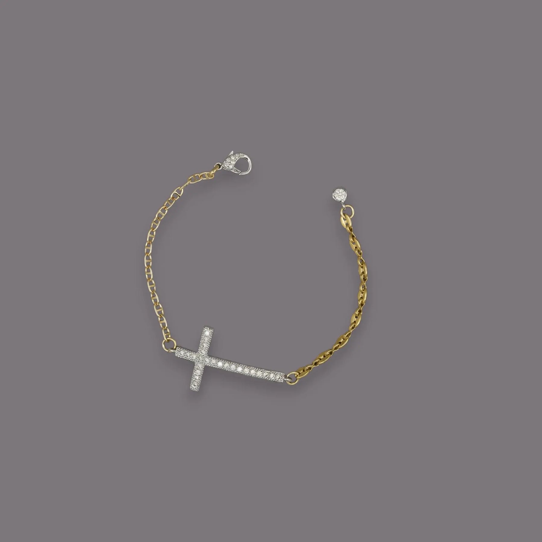 Regular price $50.00 Save $-50.00Elevate your everyday style with a piece that balances timeless devotion and modern luxury. This stunning bracelet features a slender, mariner-style chain crafted in warm, polished gold. At its heart lies a sophisticated horizontal cross, brilliantly encrusted with a shimmering pavé of Cubic Zirconias that catches the light from every angle.