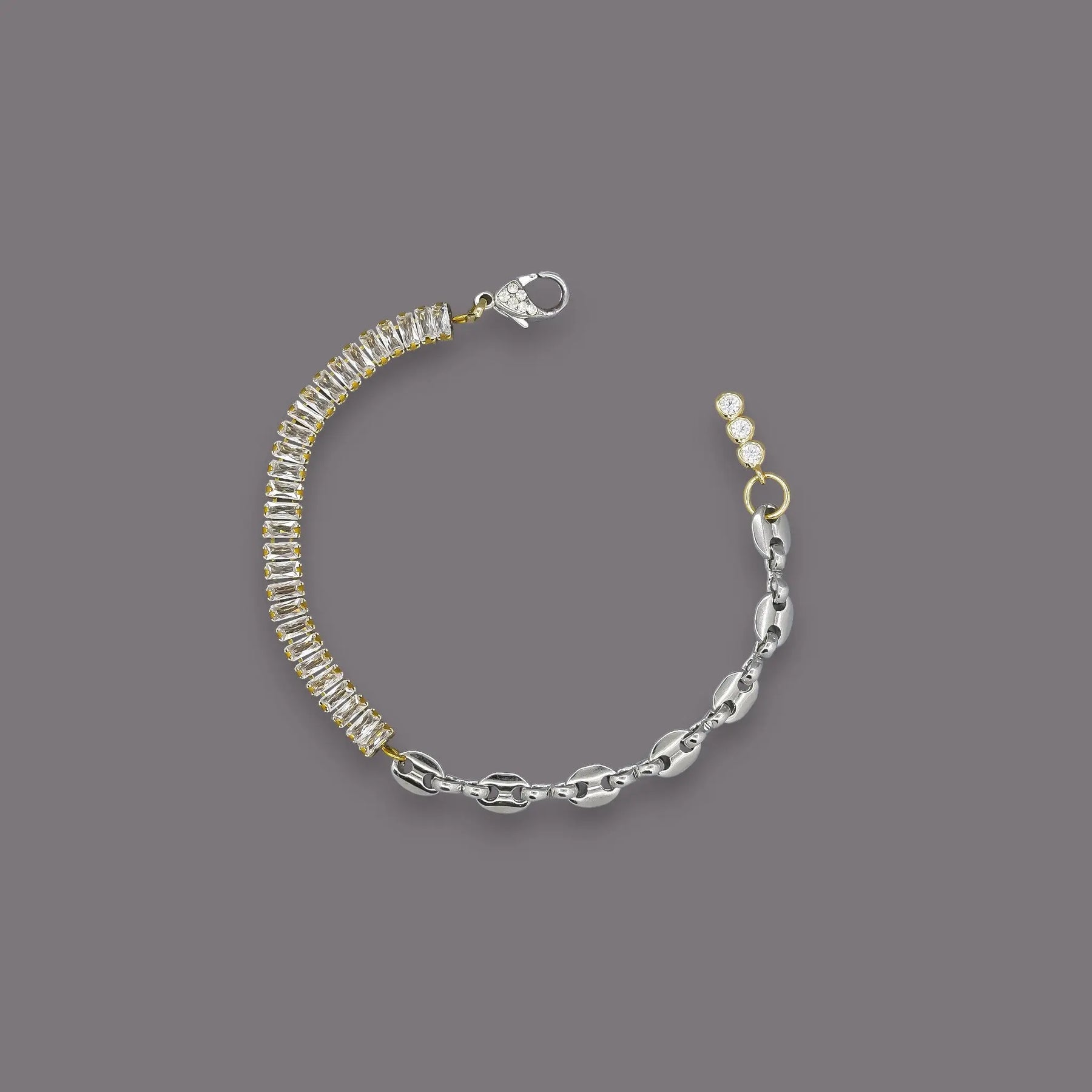 Regular price $80.00 Save $-80.00Sparkle meets strength in this striking asymmetrical design. The Luminary Mariner Bracelet features a brilliant row of 14k gold-plated CZ baguettes that transitions seamlessly into a sleek rhodium-plated mariner chain. Finished with a luxurious pavé-encrusted clasp, this piece is the ultimate high-low statement for your wrist.
