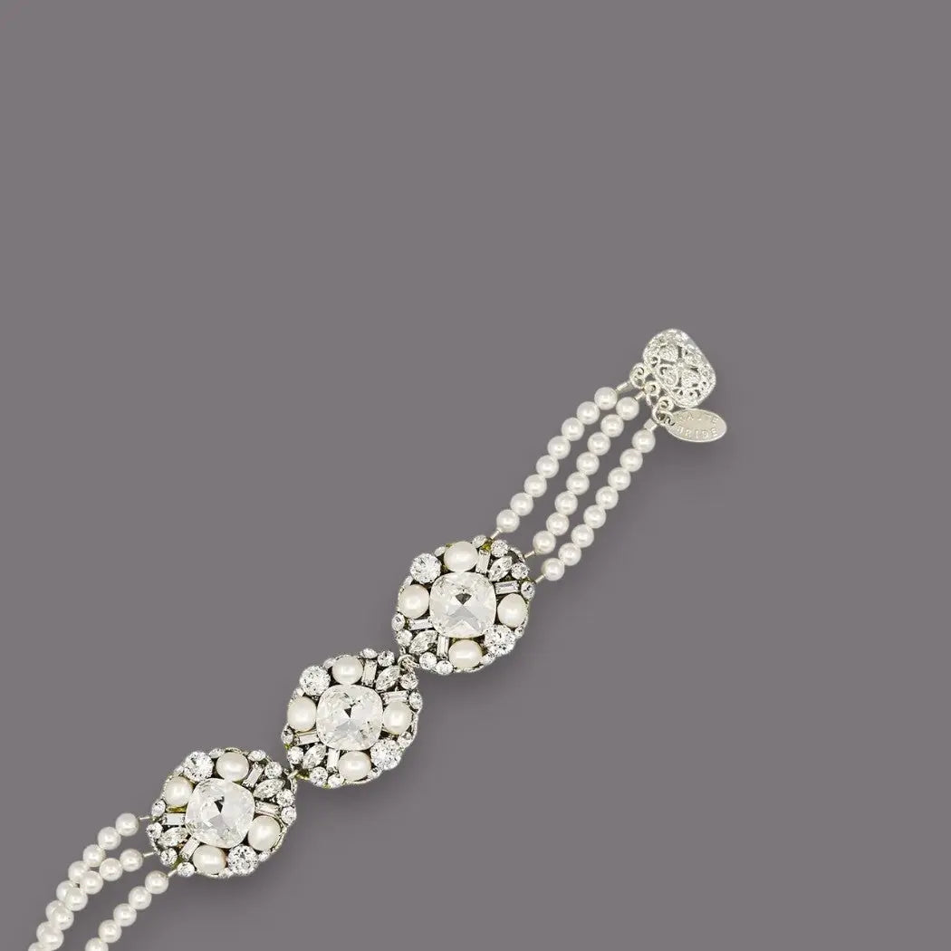 Regular price $298.00 Save $-298.00Make a statement with our three strand crystal pearl bracelet, with statement brooches. Brooches are designed with a cushion cut rhinestones, Freshwater Pearl accents and rhinestones. Filigree clasp closure.