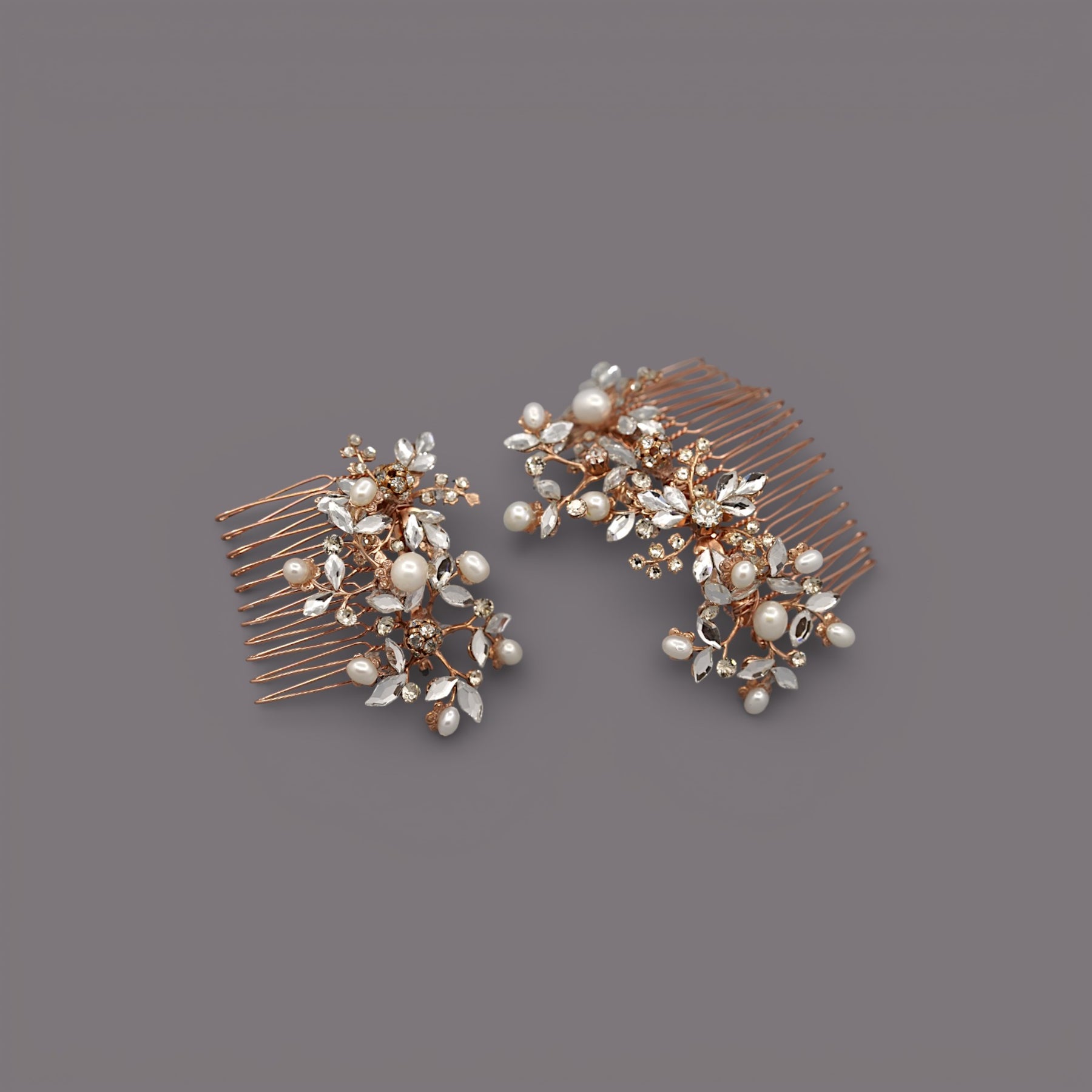 Oh, the magic of pearls and crystals! The Sarya Combs are designed for brides who want that soft, glowing touch—two beautiful hair combs handcrafted with premium Austrian crystal rhinestones and genuine freshwater pearls, expertly wire-wrapped onto sturdy combs that slide effortlessly into your hair.